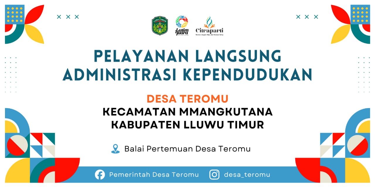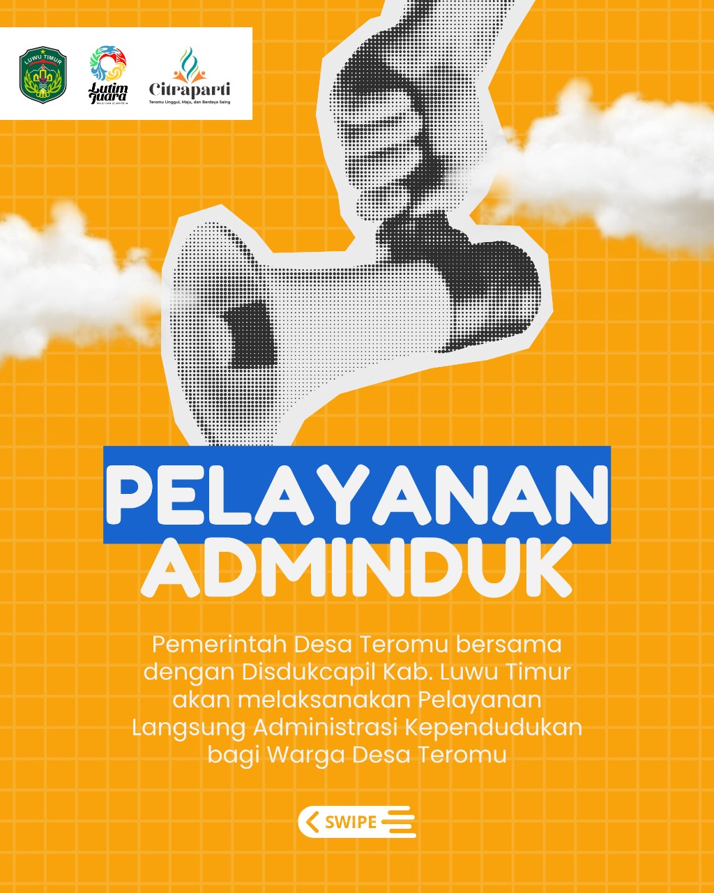 Luwu Timur, Chaneltimur.com – Pemerintah Desa Teromu bekerja sama dengan Dinas Kependudukan dan Pencatatan Sipil (Disdukcapil) Kabupaten Luwu Timur akan menggelar kegiatan Pelayanan Langsung Administrasi Kependudukan yang dipusatkan di Balai Kemasyarakatan Desa Teromu, Selasa (21/10), mulai pukul 09.30 WITA hingga selesai.