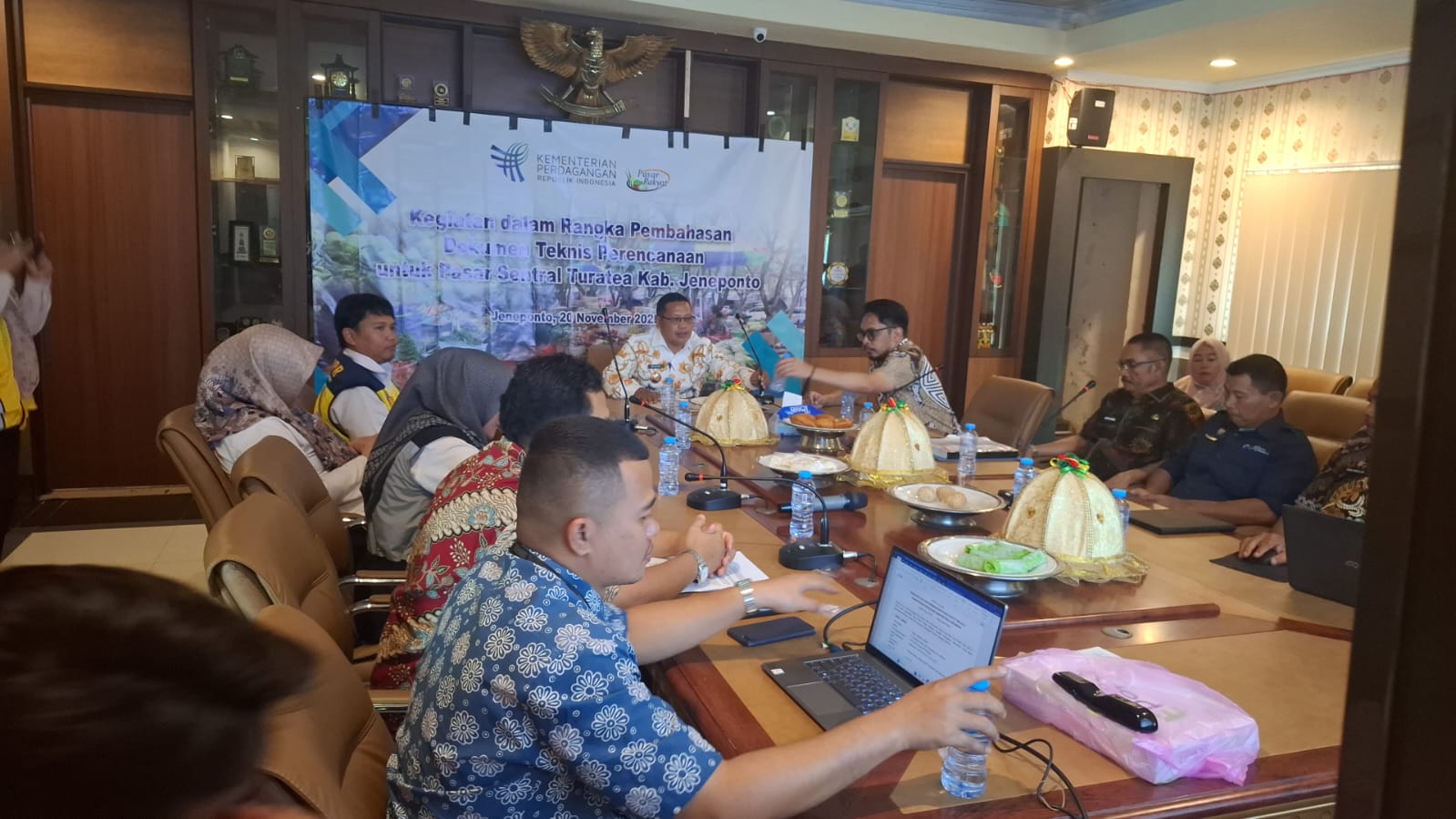 Rapat tersebut melibatkan perwakilan dari Kementerian Perdagangan serta Kementerian Pekerjaan Umum dan Perumahan Rakyat (PUPR) sebagai mitra strategis yang berperan dalam sinkronisasi teknis, regulasi, dan dukungan pemerintah pusat. Hadir pula Kepala Bappeda Jeneponto, Dr. H. Alfian Afandy Syam, S.T., M.T., Ph.D, bersama perangkat daerah terkait.