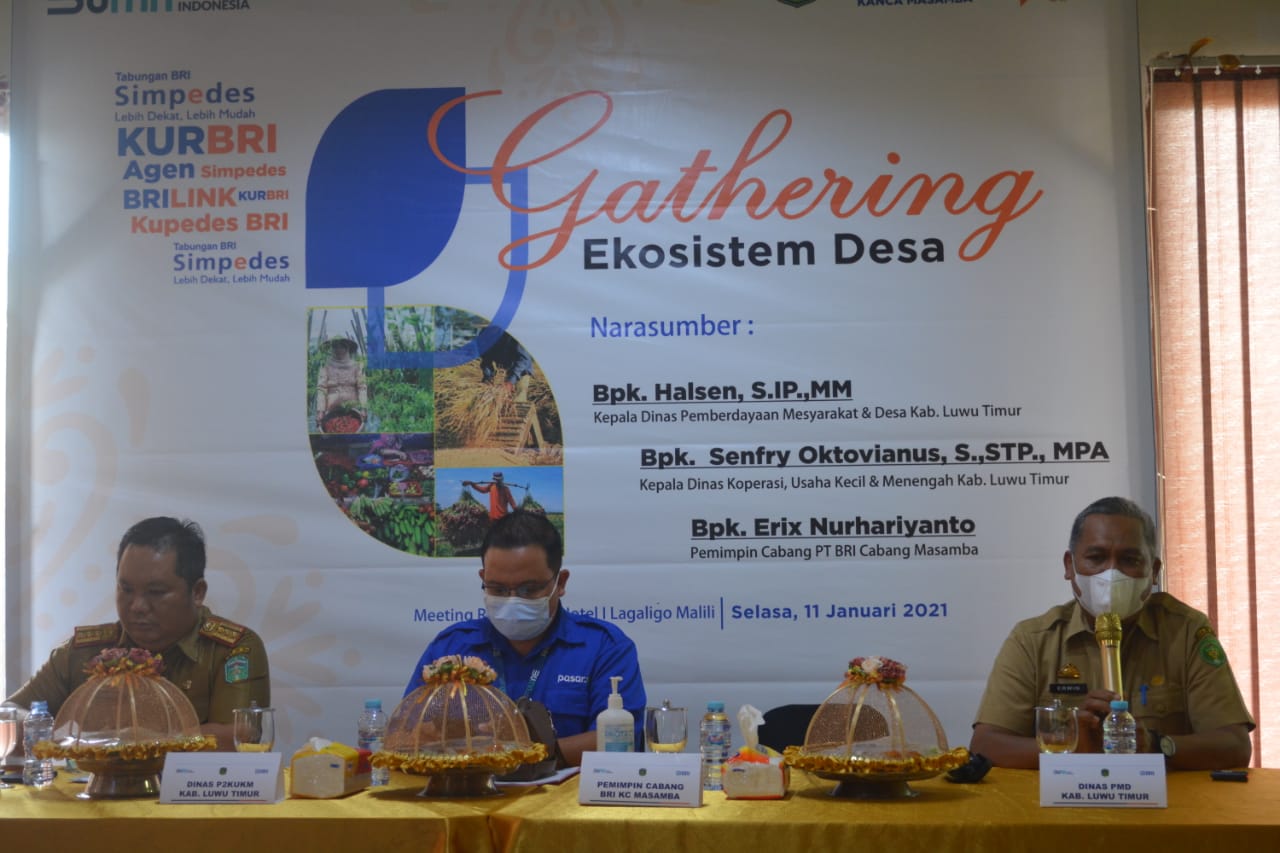 Luwu Timur,Chaneltimur.com – Pemerintah Kabupaten Luwu Timur bekerjasama dengan Bank Rakyat Indonesia (BRI) menggelar Gathering Ekosistem Desa yang berlangsung di Aula Hotel I Lagaligo, Desa Puncak Indah, Kecamatan Malili, Selasa (11/01/2022).