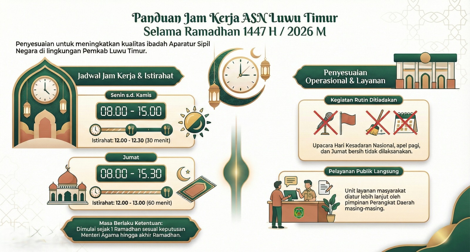 LUWU TIMUR, Chaneltimur.com – Pemerintah Kabupaten Luwu Timur resmi menerbitkan Surat Edaran tentang penyesuaian jam kerja Aparatur Sipil Negara (ASN) selama Bulan Suci Ramadhan 1447 Hijriah/2026 Masehi. Kebijakan ini bertujuan untuk meningkatkan kualitas pelaksanaan ibadah puasa tanpa mengurangi kinerja pelayanan pemerintahan.