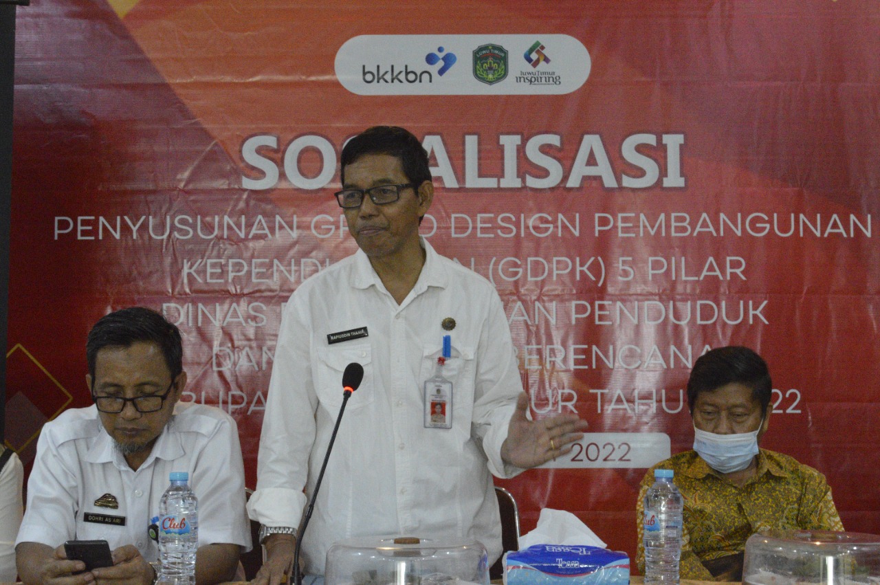 LUTIM, Chaneltimur.com – Pemerintah Kabupaten Luwu Timur, melalui Dinas Pengendalian Penduduk dan Keluarga Berencana (P2KB) menggelar kegiatan Sosialisasi Penyusunan Grand Design Pembangunan Keluarga (GDPK) lima pilar, yang dibuka oleh Staf Ahli Pembangunan, Rapiuddin Thahir, didampingi Kepala Dinas Pengendalian Penduduk dan Keluarga Berencana (P2KB), Hj. Puspawati, Kepala Bapelitbangda, Dohri Asari, bertempat di Wisma Golden House, Malili, Rabu (28/09/2022).