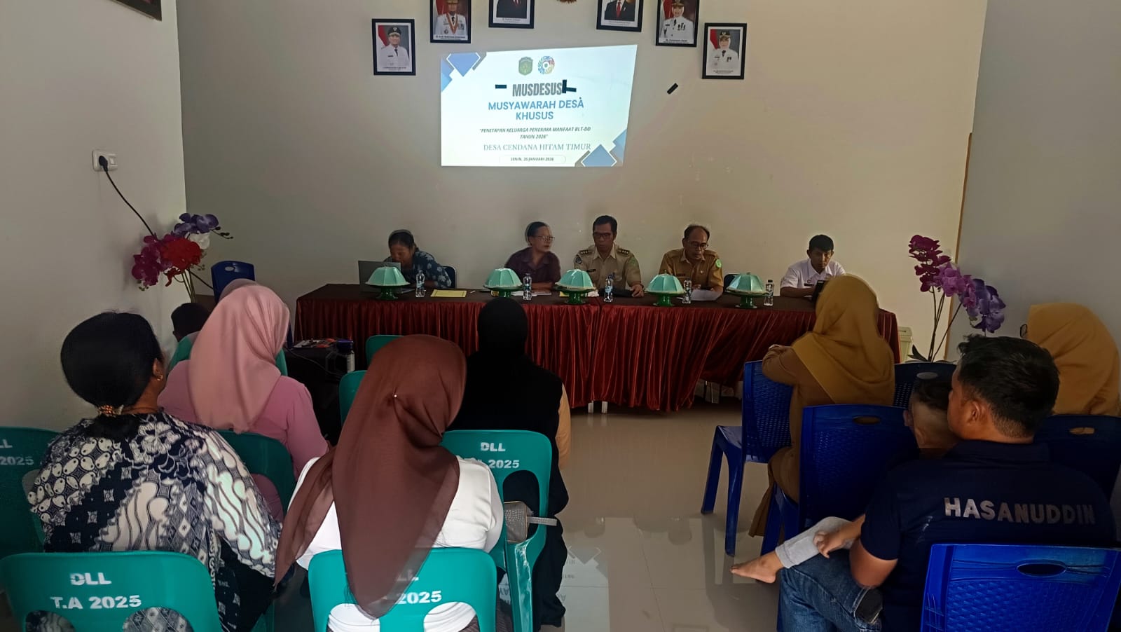 Penetapan penerima BLT DD tahun 2026 ini dilakukan melalui Musyawarah Desa Khusus (Musdesus) yang digelar pada Senin (26/01/2026) di Kantor Desa Cendana Hitam Timur. Kegiatan tersebut dihadiri Camat Tomoni Timur Yulius, Pj Kepala Desa Duma, Sekretaris Desa, Ketua BPD Dorce Kalimbuang, para Kepala Dusun, Ketua RT, Pendamping Desa, Pendamping PKH, serta unsur tokoh masyarakat.