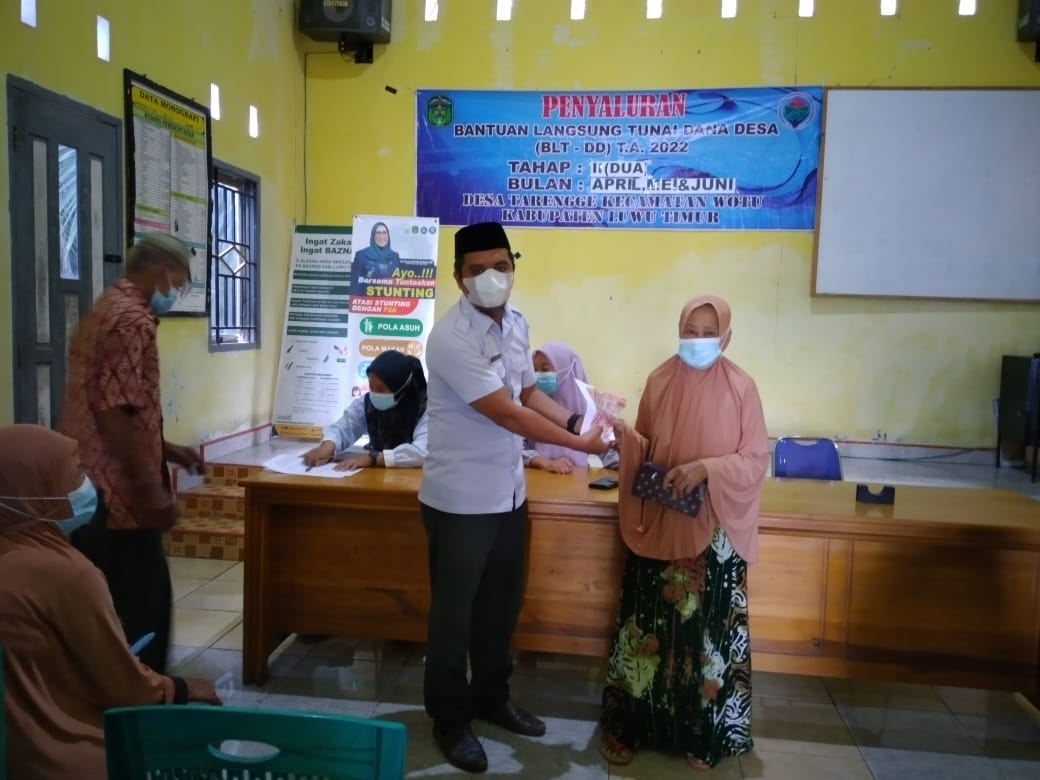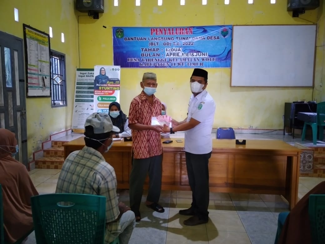 Luwu Timur, Chaneltimur.com – Bantuan Langsung Tunai Dana Desa (BLT-DD) disalurkan kepada Keluarga Penerima Manfaat (KPM) di Desa Tarengge, Kec. Wotu, Penyaluran yang dilaksanakan di Aula Kantor Desa Tarengge, Rabu (29/6/2022) merupakan penyaluran BLT-DD untuk Tahap II bulan April-Juni Tahun 2022.