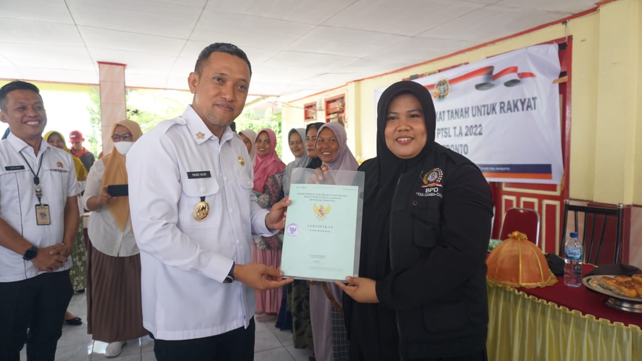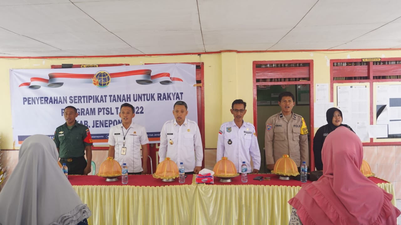 Jeneponto,Chaneltimur.Com – Wakil bupati H. Paris Yasir dan kepala kantor pertanahan Irvan Tamrin kompak bagikan sertipikat tanah ke puluhan Kepala Keluarga, Penyerahan sertipikat tanah berlangsung di Aula Kantor desa Camba-camba, kecamatan Batang, Rabu, 26/10/2022.