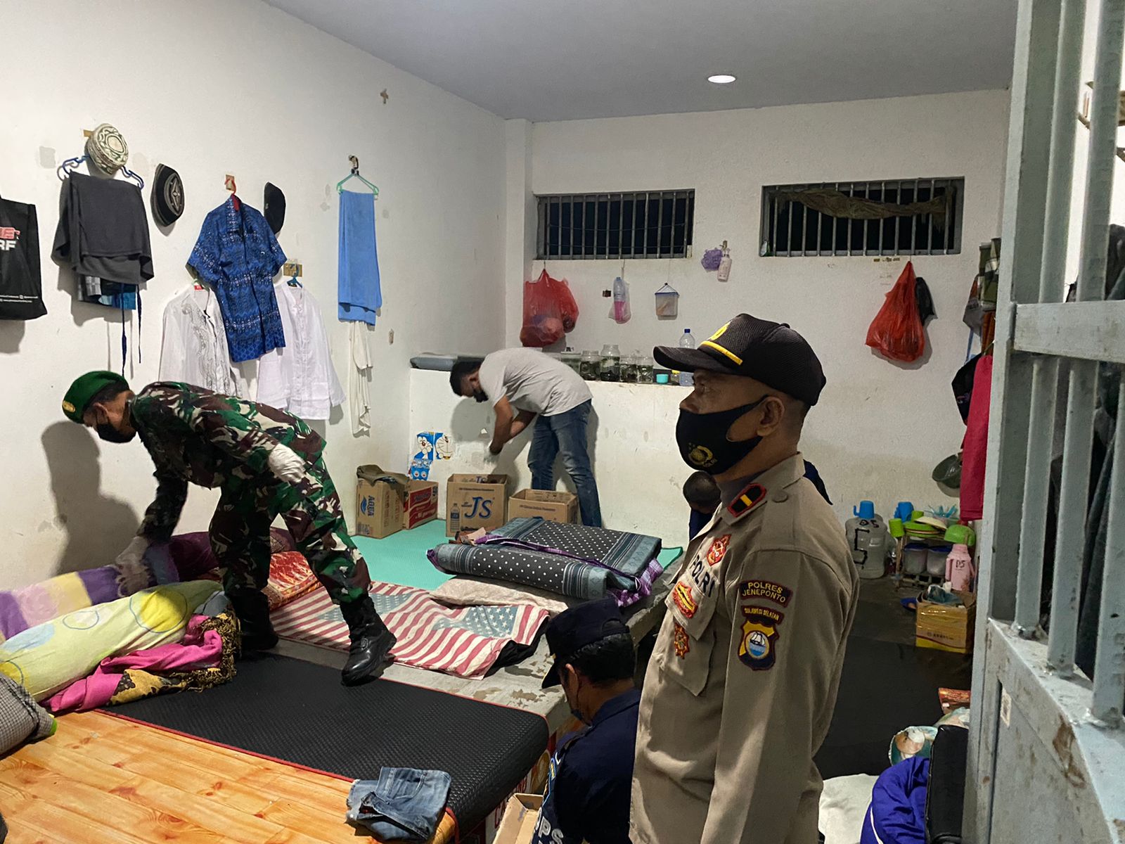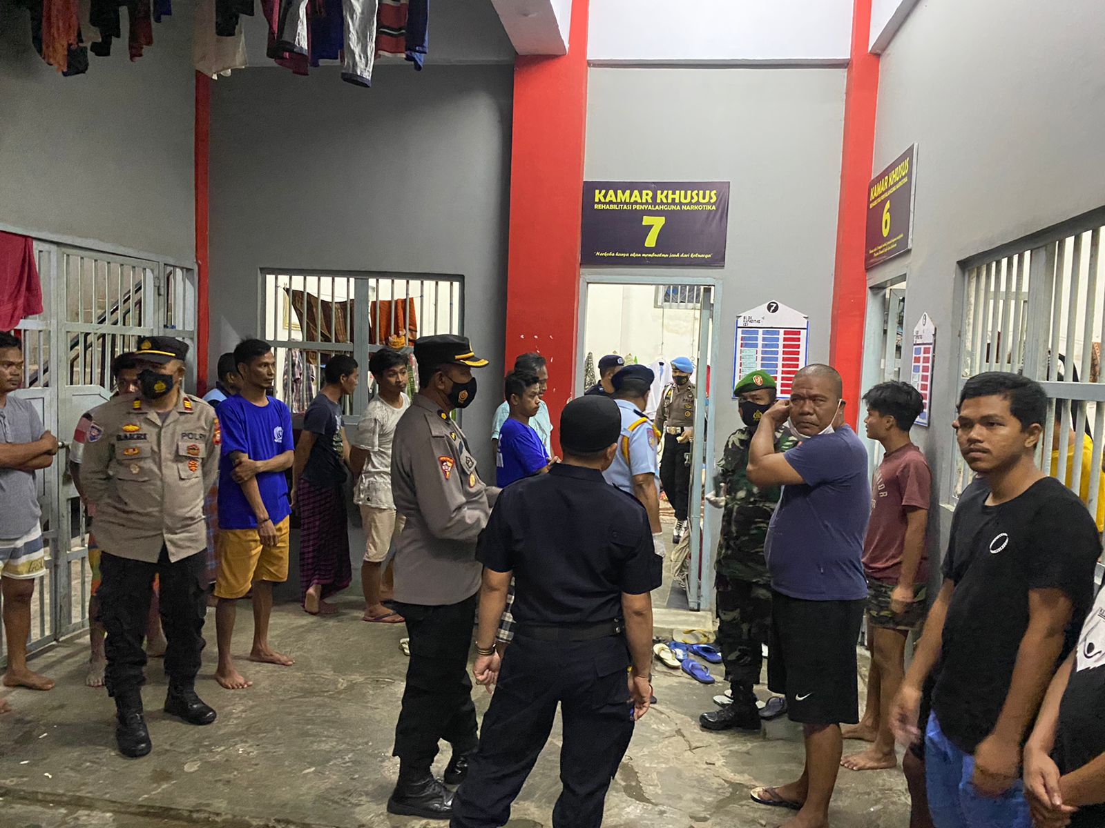 Kalapas kelas II.B Jeneponto bersama rombongan personil gabungan melakukan pengawasan dan pengecekan pengamanan di area sekeliling blok dengan maksud dan tujuan agar terwujudnya lingkungan rutan yang aman, tertib dan kondusif disampaikan juga bagi warga binaan lapas untuk tetap disiplin patuhi protkes guna meminimalisir penyebaran covid-19 dilingkungan lembaga pemasyarakatan, dalam kegiatan razia tersebut tidak di temukan barang-barang berbahaya di ruangan/blok warga binaan dan razia gabungan ini berakhir sekitar pukul 23.00 wita.Ucapnya ” ( Mansur Lau )