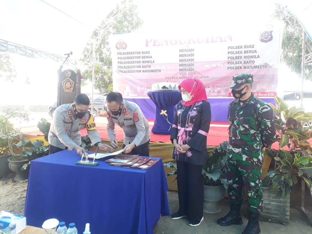 Peningkatan status lima Polsubsektor jadi Polsek tersebut ditandai dengan diresmikan pengoperasiannya secara simbolis di Polsek Buke oleh Kapolda Sulawesi Tenggara (Sultra) Irjen Pol Drs Yan Sultra I.,SH di dampingi Penjabat (Pj) Bupati Konsel Dra Hj Andi Tenri Rawe Silondae MM dan Kapolres Konsel AKBP Erwin Pratomo SIK. Kamis 25 Maret 2021.