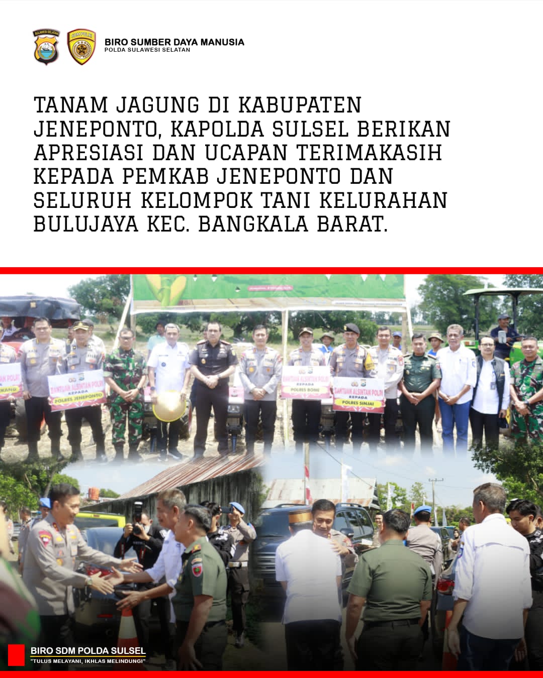 Kapolda Sulsel bersama rombongan tiba di Kelurahan Bulujaya, Kecamatan Bangkala Barat, Kabupaten Jeneponto, sekitar pukul 10.00 WITA, yang menjadi lokasi pelaksanaan penanaman jagung serentak terpusat di Sulawesi Selatan.