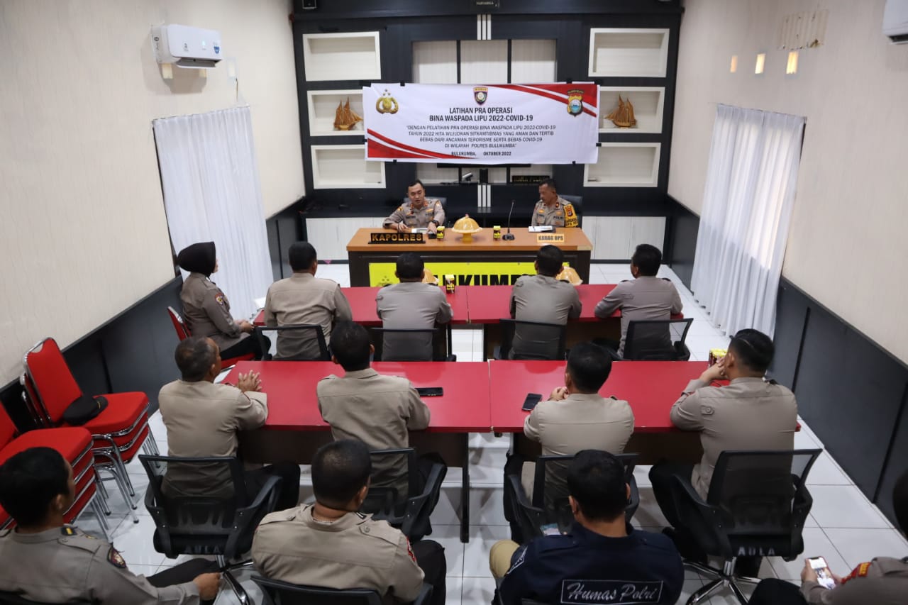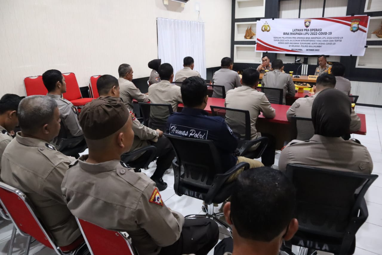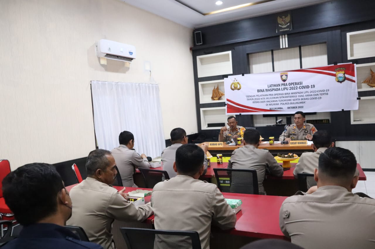 BULUKUMBA, Chaneltimur.com – Kepolisian Resor Bulukumba Polda Sulsel, menggelar kegiatan latihan Pra Operasi Bina Waspada Lipu 2022 – Covid 19 bertempat di Aula Vidcom Polres Bulukumba, Senin (24/10/2022).