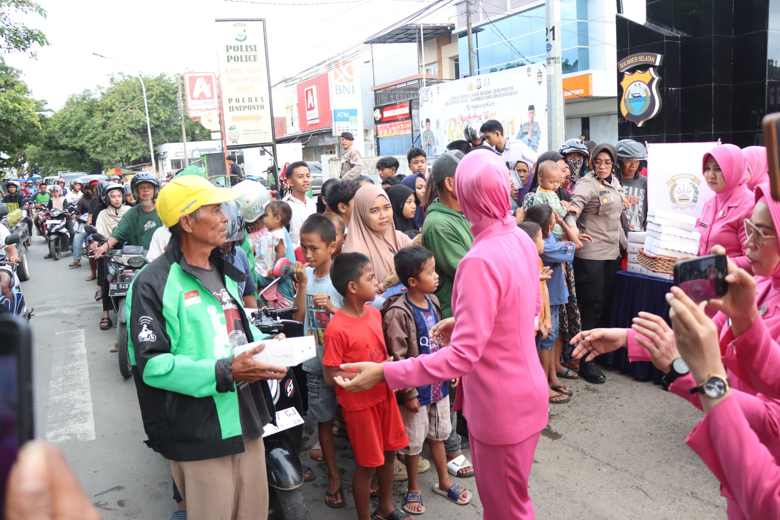 Suasana semakin semarak dengan kehadiran Ketua Bhayangkari Cabang Jeneponto, Ny. Ratih Haryo, beserta sejumlah anggota Bhayangkari. Para ibu Bhayangkari dengan sigap turun langsung membagikan paket takjil kepada para pengendara dan warga yang berada di sekitar lokasi.