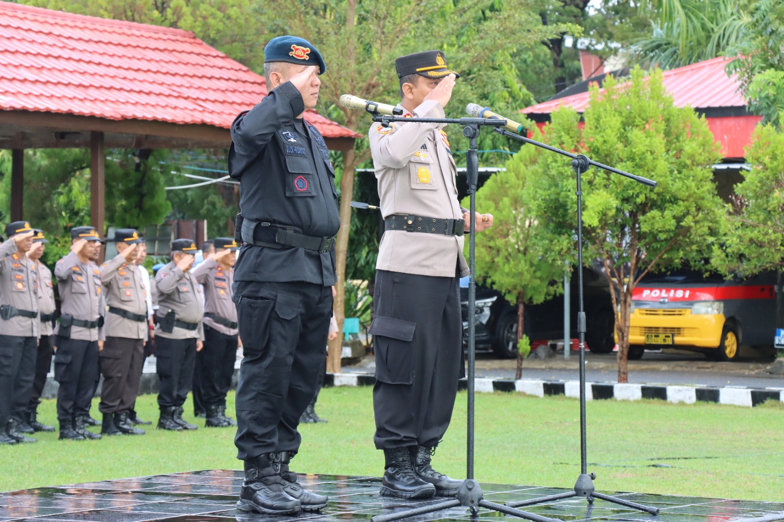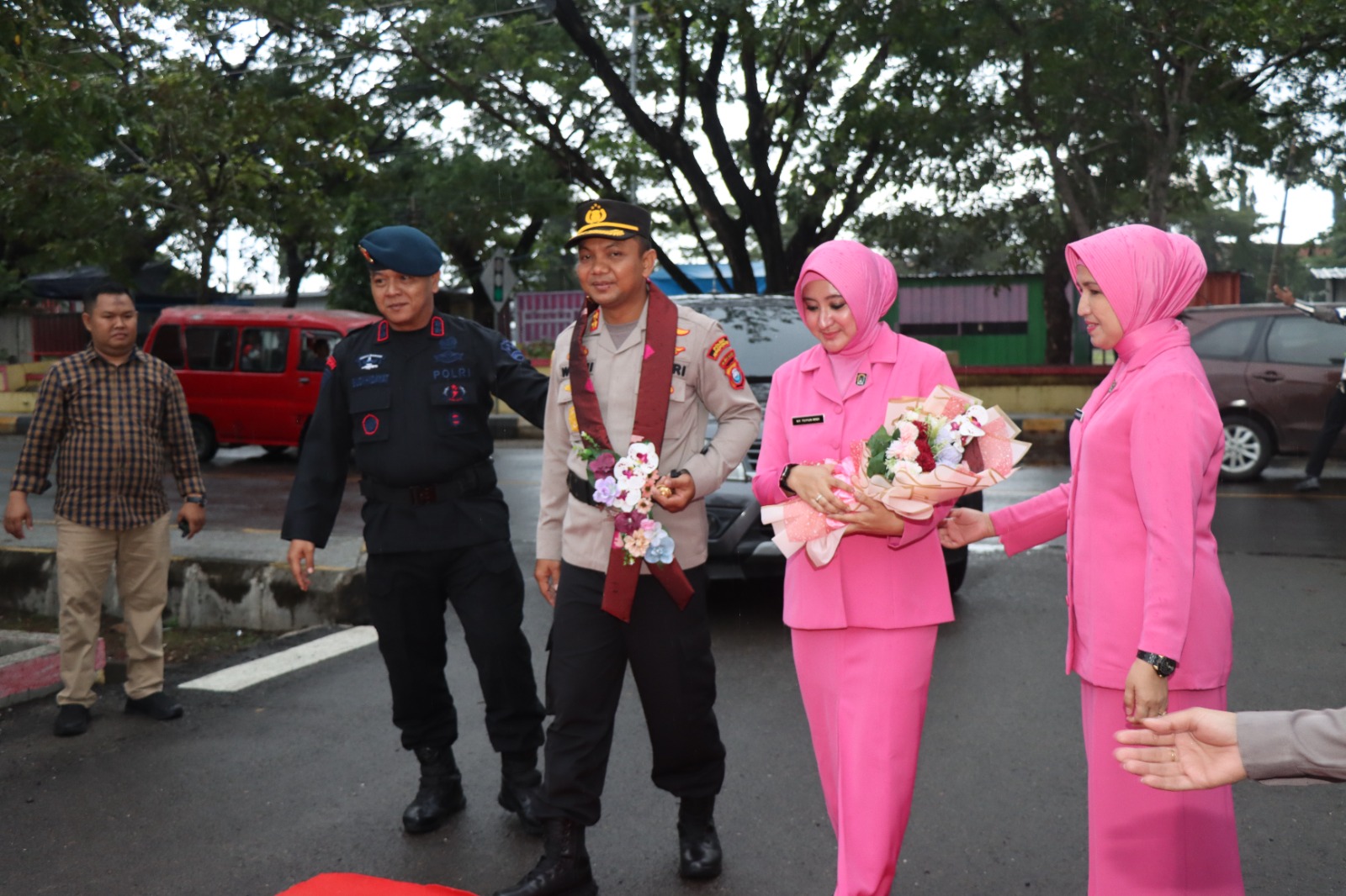 Kedatangan Akbp Widi Setiawan, S.I.K., M.I.K. dimaknai dengan pengalungan bunga oleh Waka Polres Jeneponto Kompol Muh. Idris, S.Sos., MM.