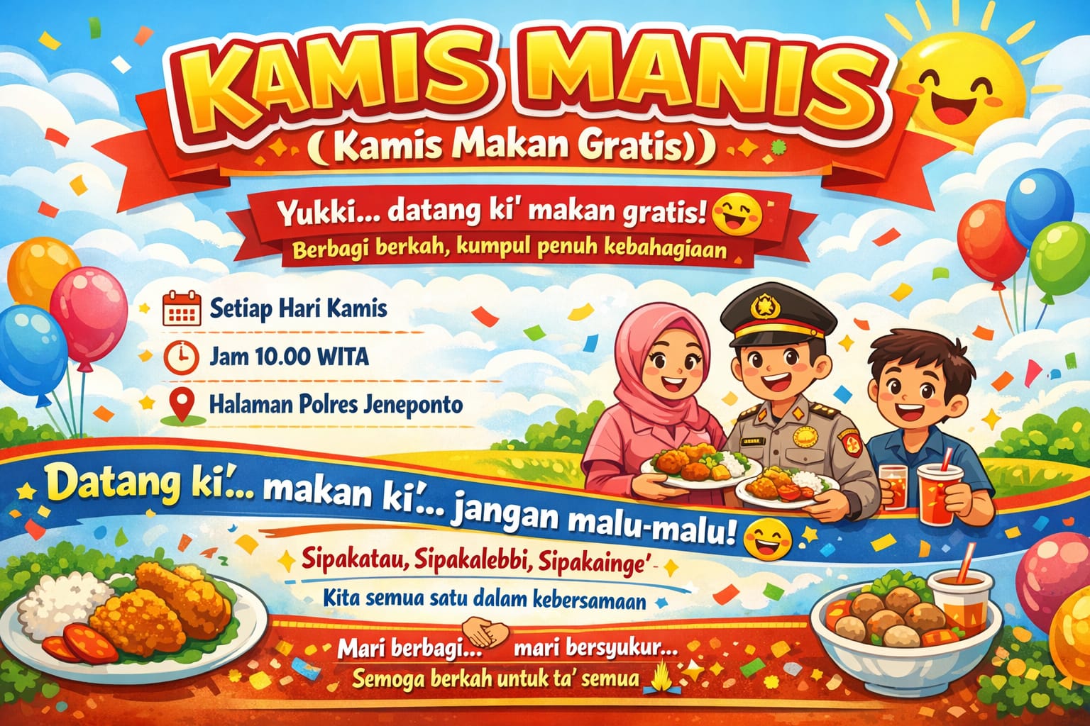 Kapolres Jeneponto AKBP Haryo Basuki, S.I.K, MH mengatakan Melalui ajakan “Yukki… datang ki’ makan gratis!”, masyarakat diundang untuk hadir, menikmati hidangan yang disediakan, sekaligus mempererat tali silaturahmi dalam suasana penuh kebersamaan dan kekeluargaan.