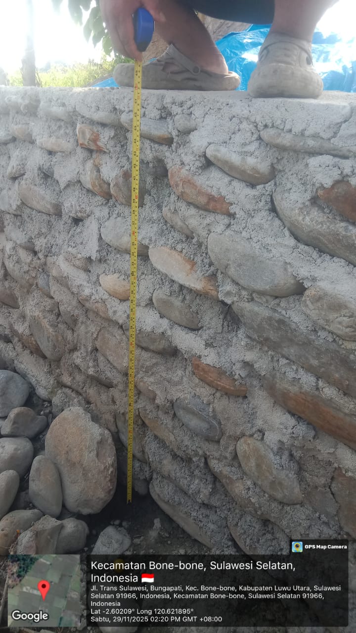 Ketua Forum Komunikasi LSM-PERS Luwu Utara , “Hasil pantauan kita kali ini 29 November 2025, apa yang kita lihat setelah kita ukur ketinggian pasangan batu dinding saluran irigasi tersebut masih sama dengan hasil pantauan kita dari awal’ volume ketinggian pasangan batu dinding saluran bervariasi dan di duga kuat tidak sesuai gambar (bestek).