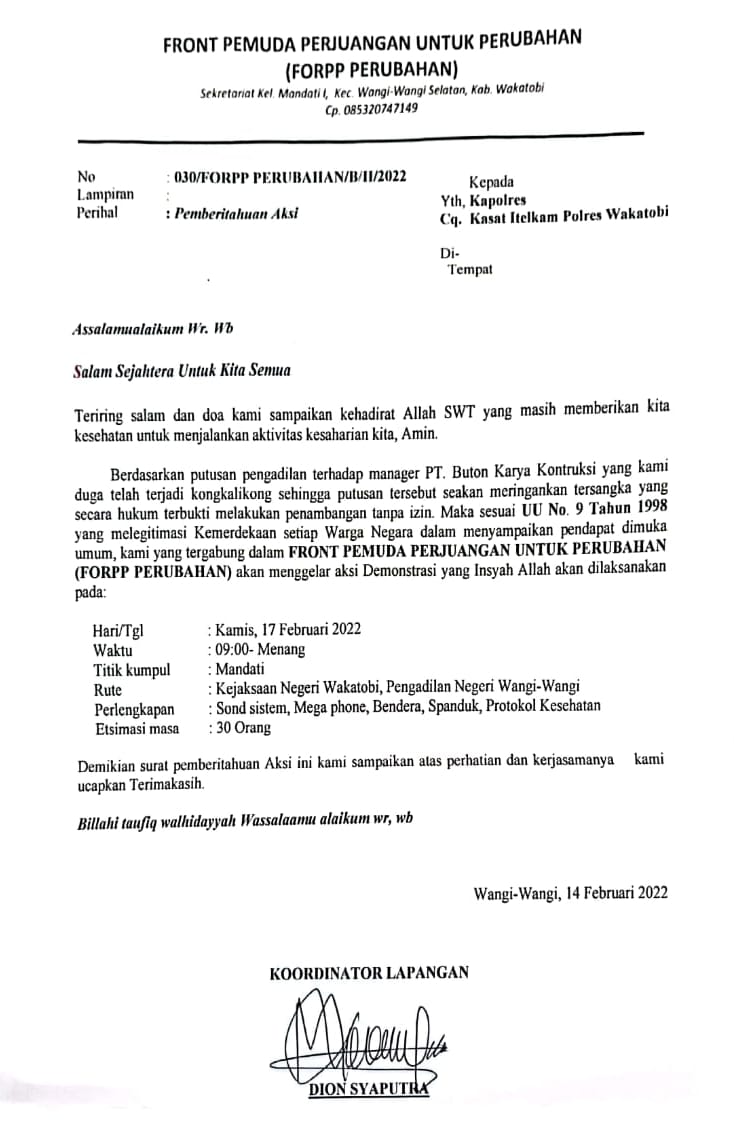 rencananya mereka akan melakukan Aksi Unjuk Rasa (Unras) hari ini, Kamis (17/02/2022) di PN Wangi-Wangi dan Kejaksaan Negeri(Kajari) Wakatobi dengan estimasi masa sebanyak 30 orang