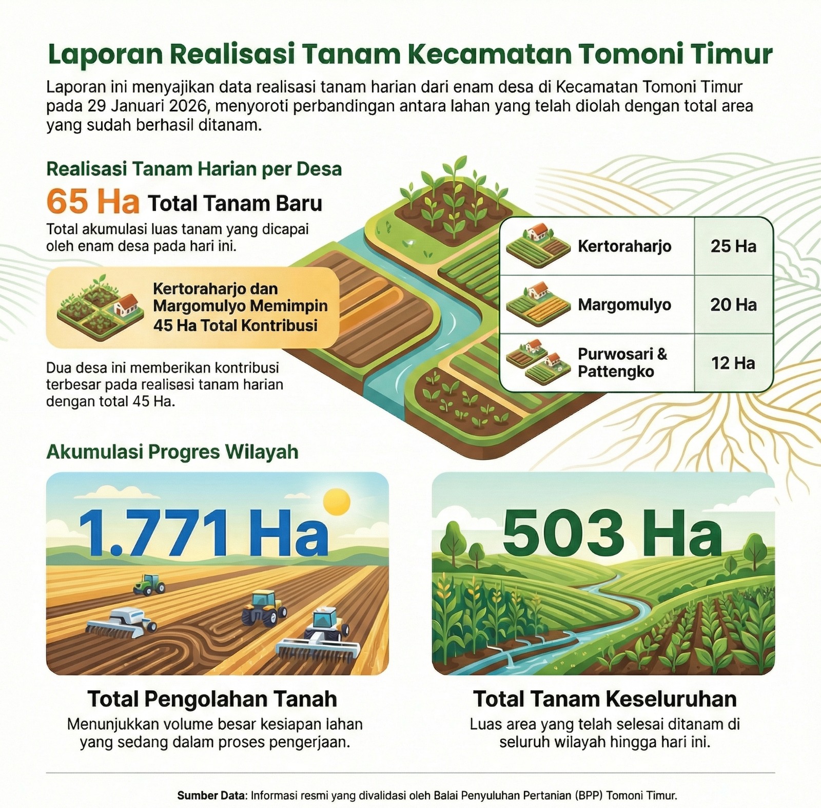 LUWU TIMUR, Chaneltimur.com – Realisasi tanam harian di Kecamatan Tomoni Timur, Kabupaten Luwu Timur, Sulawesi Selatan, pada 29 Januari 2026 mencapai 65 hektare. Capaian ini berasal dari kontribusi enam desa, dengan Desa Kertoraharjo dan Margomulyo menjadi penyumbang terbesar.