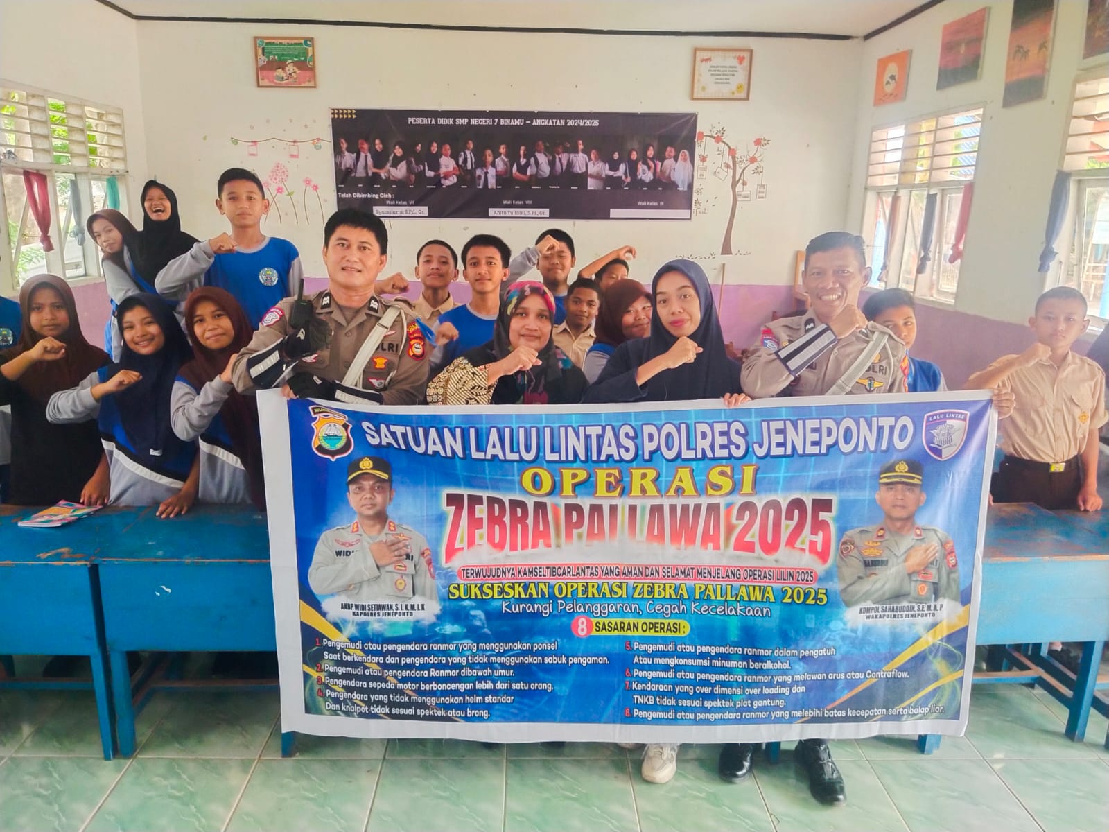 Jeneponto, Chaneltimur.com – Dalam rangkaian Operasi Zebra Pallawa 2025 hari keenam, Satuan Lalu Lintas (Sat Lantas) Polres Jeneponto menghadirkan program “Polisi Goes to School”. Kegiatan yang berlangsung pada Sabtu (22/11/2025) hari ini menyasar para pelajar di UPT SMP Negeri 7 Binamu, Kelurahan Empoang, Kecamatan Binamu.