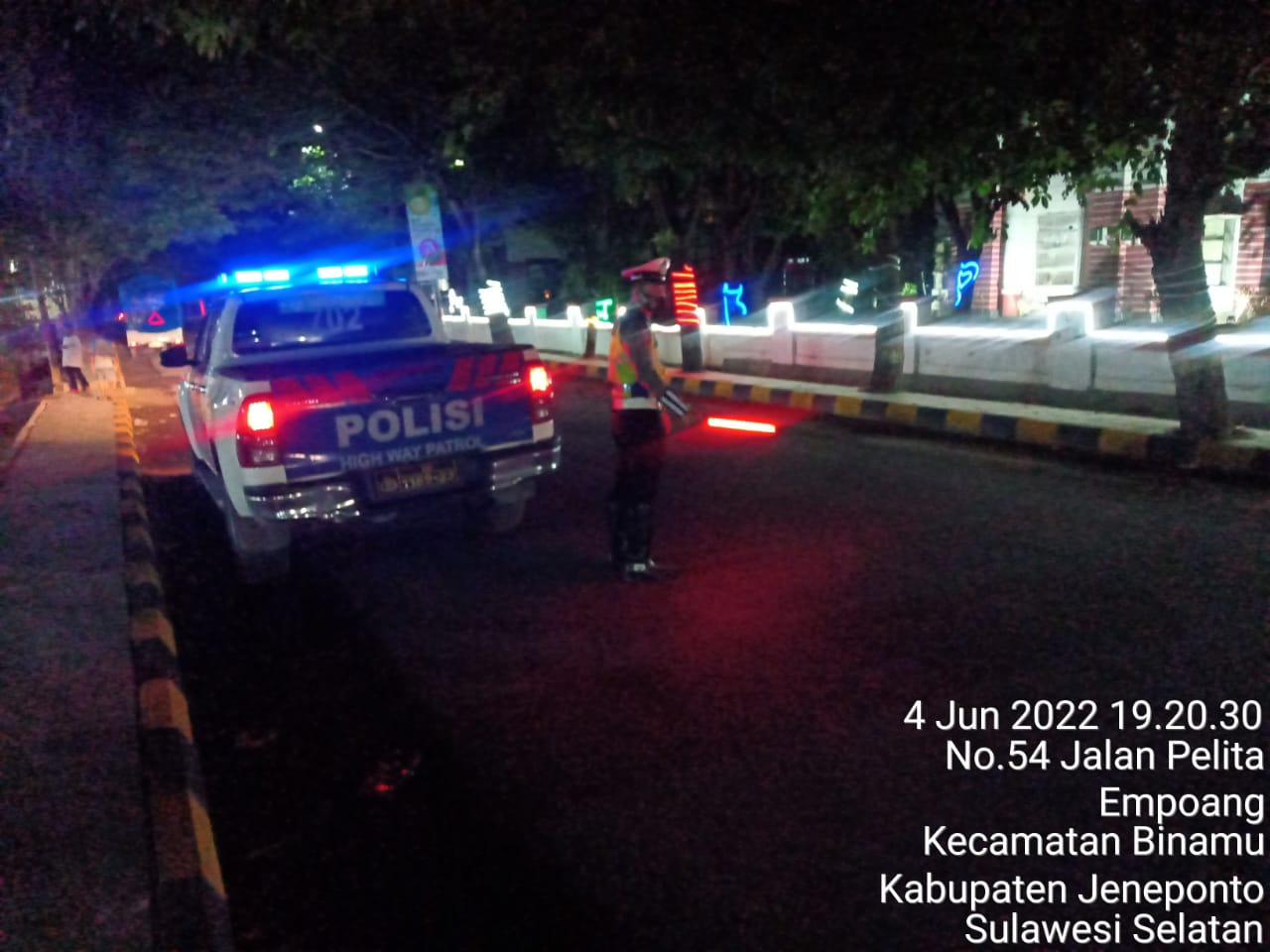 Jeneponto, Chaneltimur.Com – Dalam menciptakan situasi kamseltibcar lantas di kota bontosunggu kelurahan empoang kecamatan binamu kabupaten jeneponto yang merupakan jalan poros provinsi agar tetap kondusif terjaga dan lancar terlebih saat malam minggu,satuan lalu lintas polres jeneponto melaksanakan patroli dan pengaturan di beberapa titik rawan kemacetan seperti jalan pahlawan (depan minimarket alfamidi dan alfamard) dan perlimaan jalan lingkar serta dekat jembatan belokallong (ex patung tani) turi (depan minimarket misi pasar raya) kelurahan empoang kecamatan binamu kabupaten jeneponto. Sabtu/4/6/2022