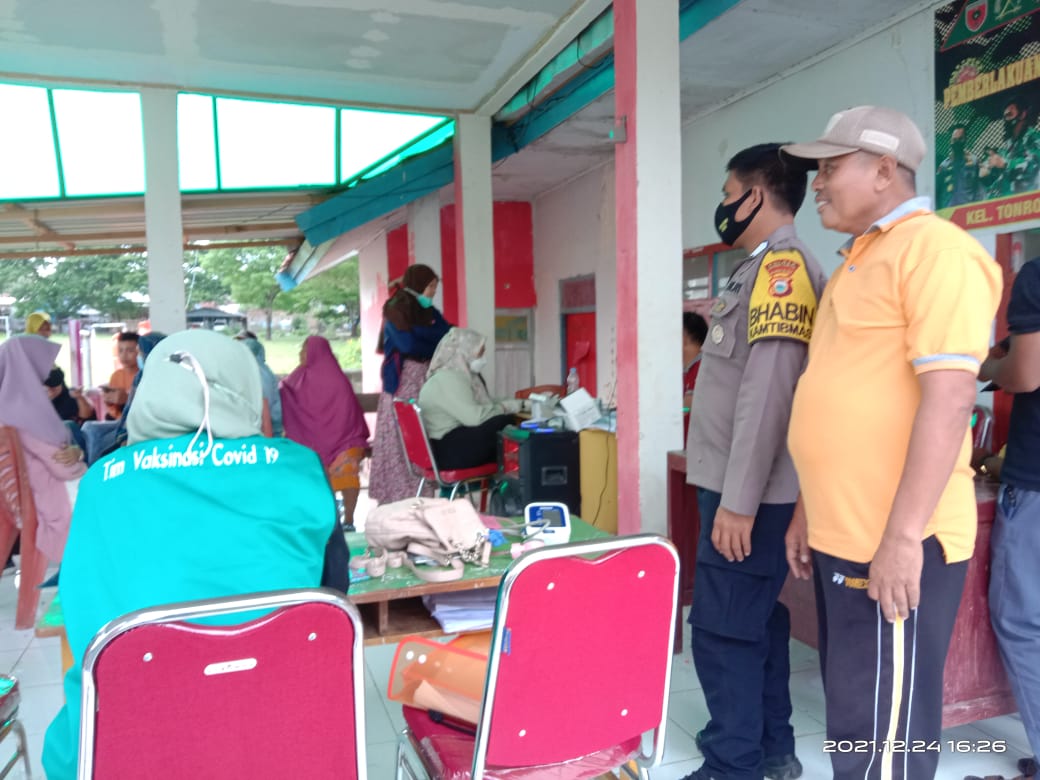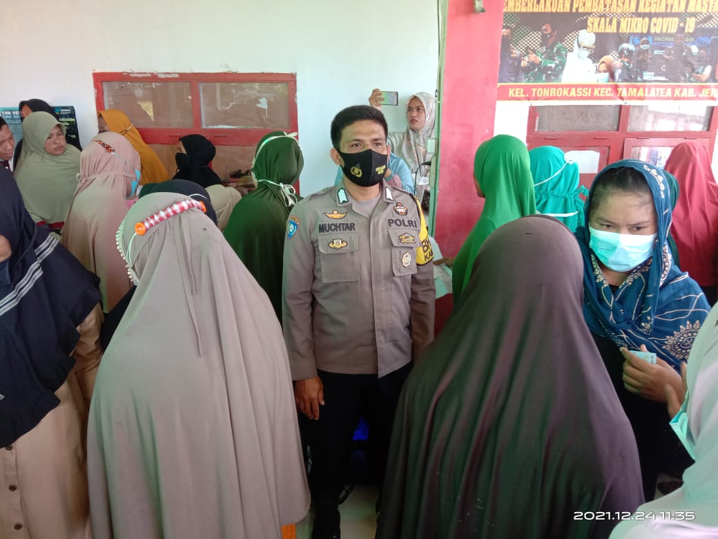 Bhabinkamtibmas Bripka Muhtar bersama Babinsa Sertu Hamzah melakukan pengawasan kegiatan yang di selenggarakan pemerintah kelurahan tonrokassi timur bekerjasama dengan tim vaksinator dari puskesmas tamalatea.