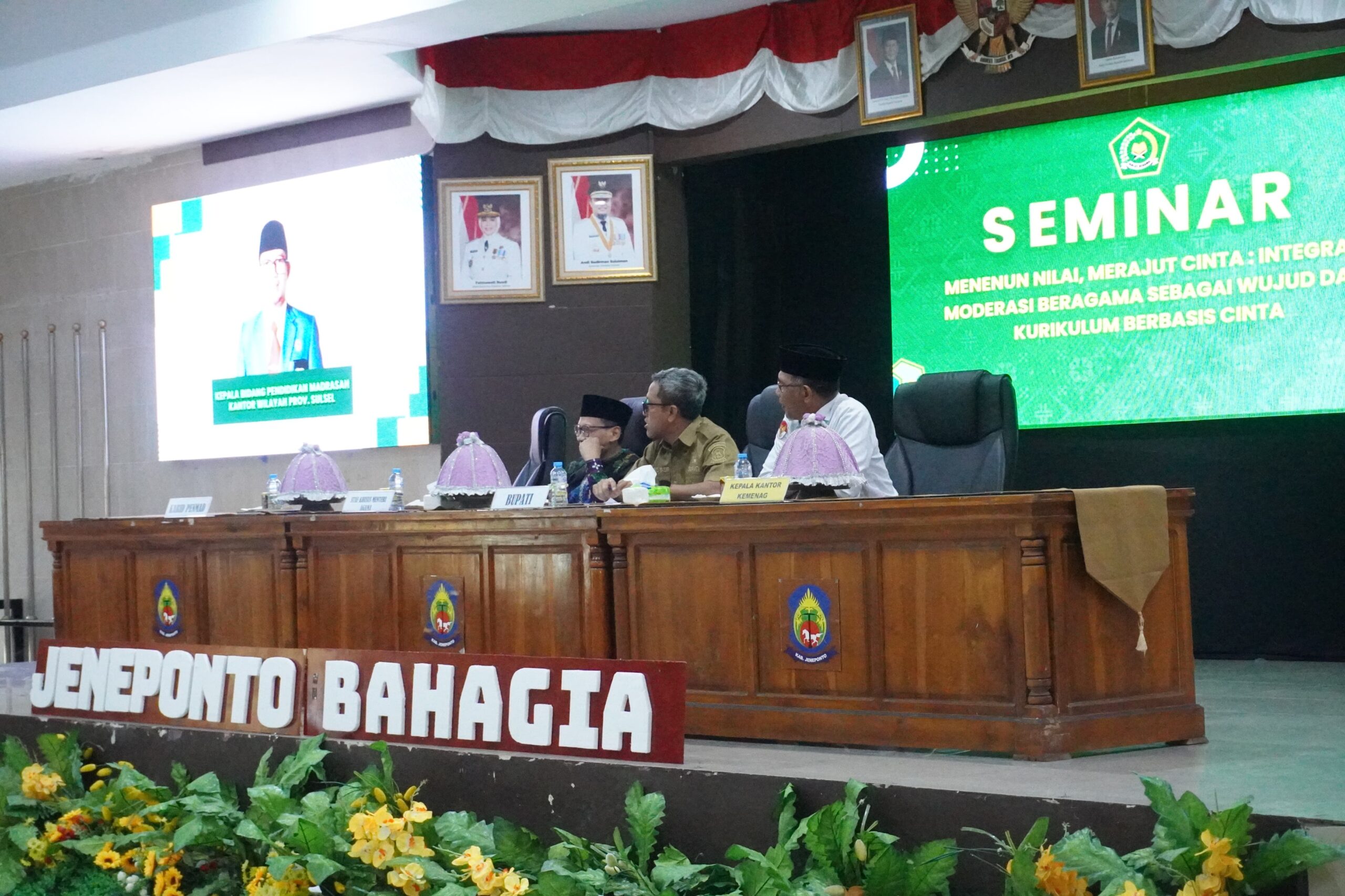 Seminar tersebut menghadirkan para pendidik, kepala sekolah madrasah, pengawas, penyuluh agama, akademisi, serta pemerhati pendidikan di Kabupaten Jeneponto. Acara ini menjadi ruang strategis untuk memperkuat implementasi Kurikulum Merdeka, khususnya melalui pendekatan humanis, moderatif, dan berorientasi pada karakter.