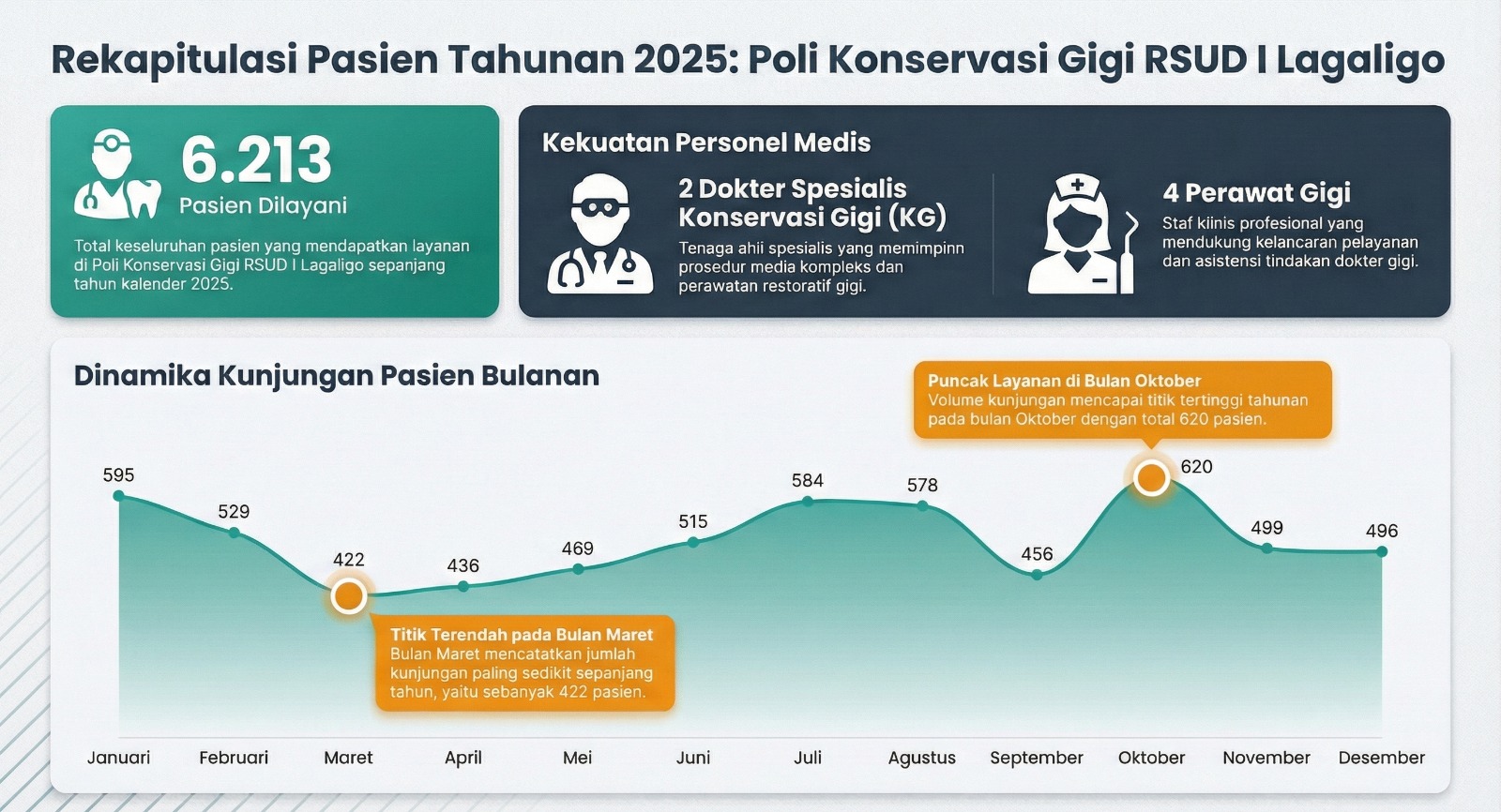 Luwu Timur, Chaneltimur.com – Jumlah pasien yang mendapatkan pelayanan kesehatan di Poli Konservasi Gigi RSUD I Lagaligo Wotu, Kabupaten Luwu Timur, sepanjang tahun 2025 tercatat mencapai 6.213 orang. Data ini menunjukkan tingginya kebutuhan masyarakat terhadap layanan perawatan dan pelestarian gigi.