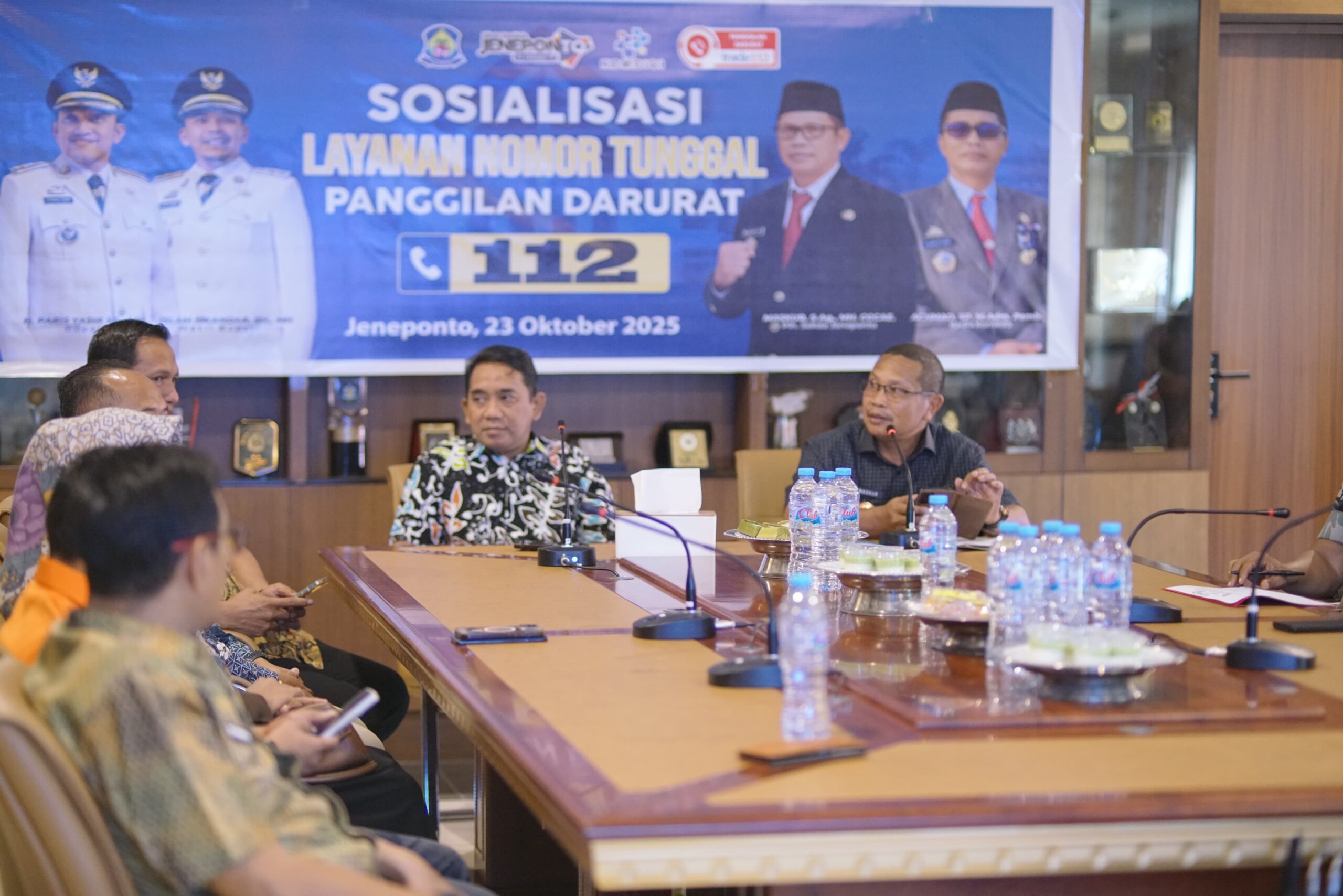 Jeneponto, Chaneltimur.com – Kementerian Komunikasi dan Digital (Komdigi) Republik Indonesia melaksanakan kegiatan Sosialisasi Layanan Nomor Tunggal Panggilan Darurat (NTPD) 112 di Ruang Rapat Bupati Jeneponto. Kegiatan ini dihadiri oleh tim dari Kementerian Komdigi yang dipimpin oleh Agung Setio Utama selaku Ketua Tim, bersama anggota Rismanto, Irwan Abdul Rahman, dan Hari Rianto, Kamis 23/10/2025