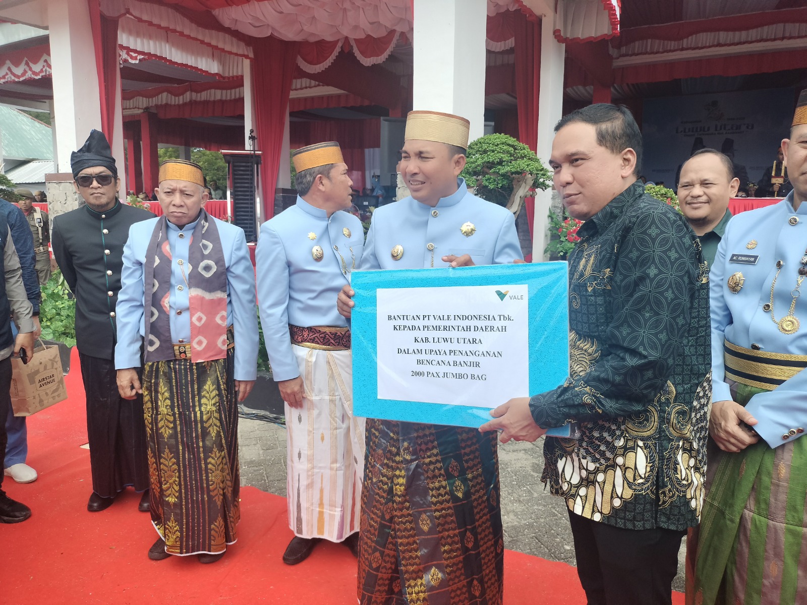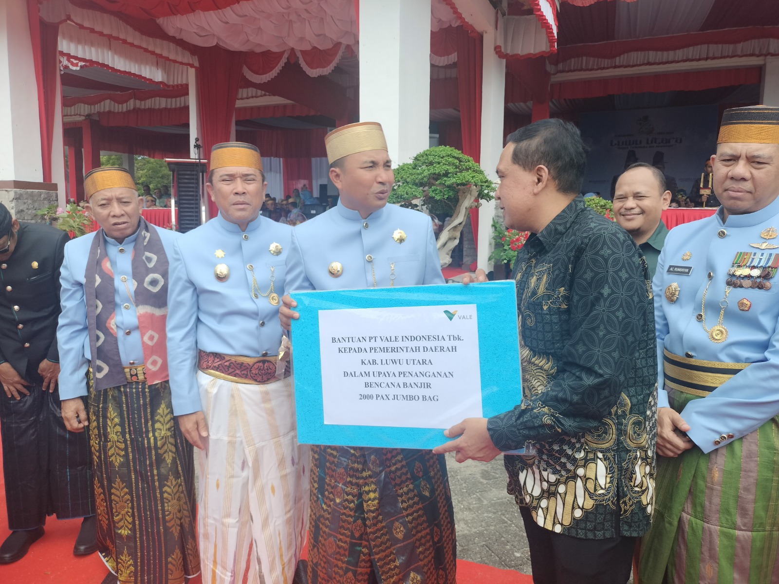Salah satunya datang dari PT Vale Indonesia Tbk. Perusahaan tambang dan pengelolaan nikel ini berkontribusi memberikan bantuan kantong “jumbo bag” untuk penanganan banjir Malangke. Bantuan PT Vale diterima Bupati pada puncak perayaan Hari Jadi XXVI Luwu Utara, Selasa (20/5/2025), di Lapangan Taman Siswa (Tamsis), Masamba.