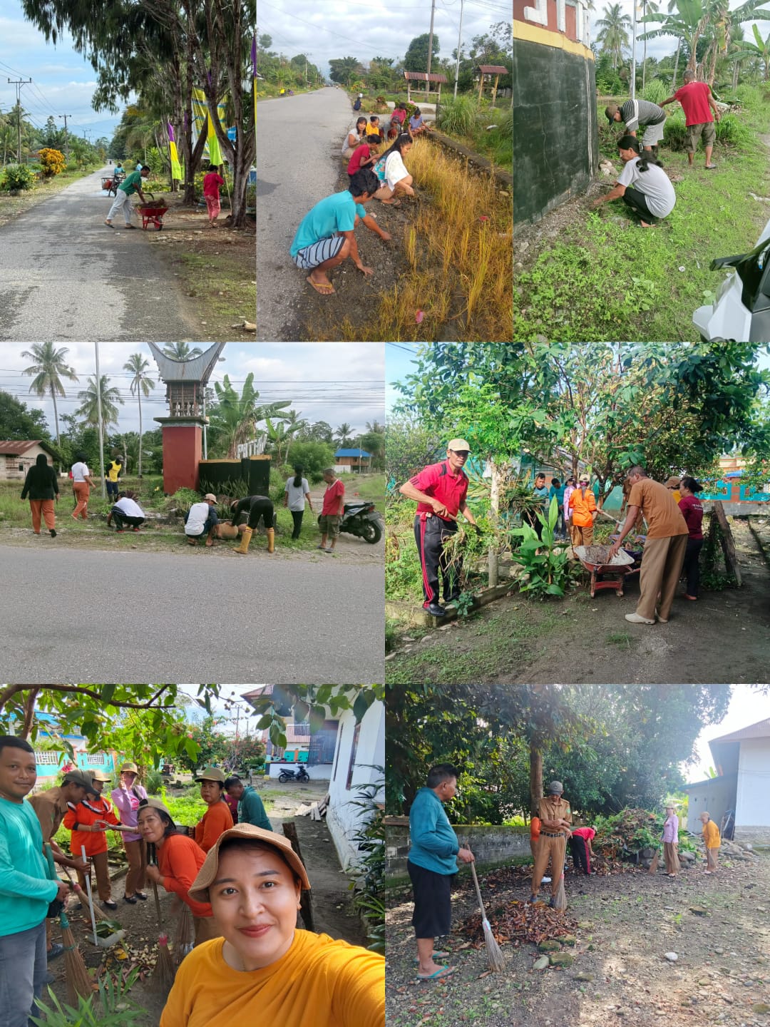Kegiatan tersebut melibatkan aparat desa bersama masyarakat setempat dalam upaya menjaga kebersihan lingkungan. Warga bergotong royong membersihkan jalan desa, saluran drainase, serta area fasilitas umum.