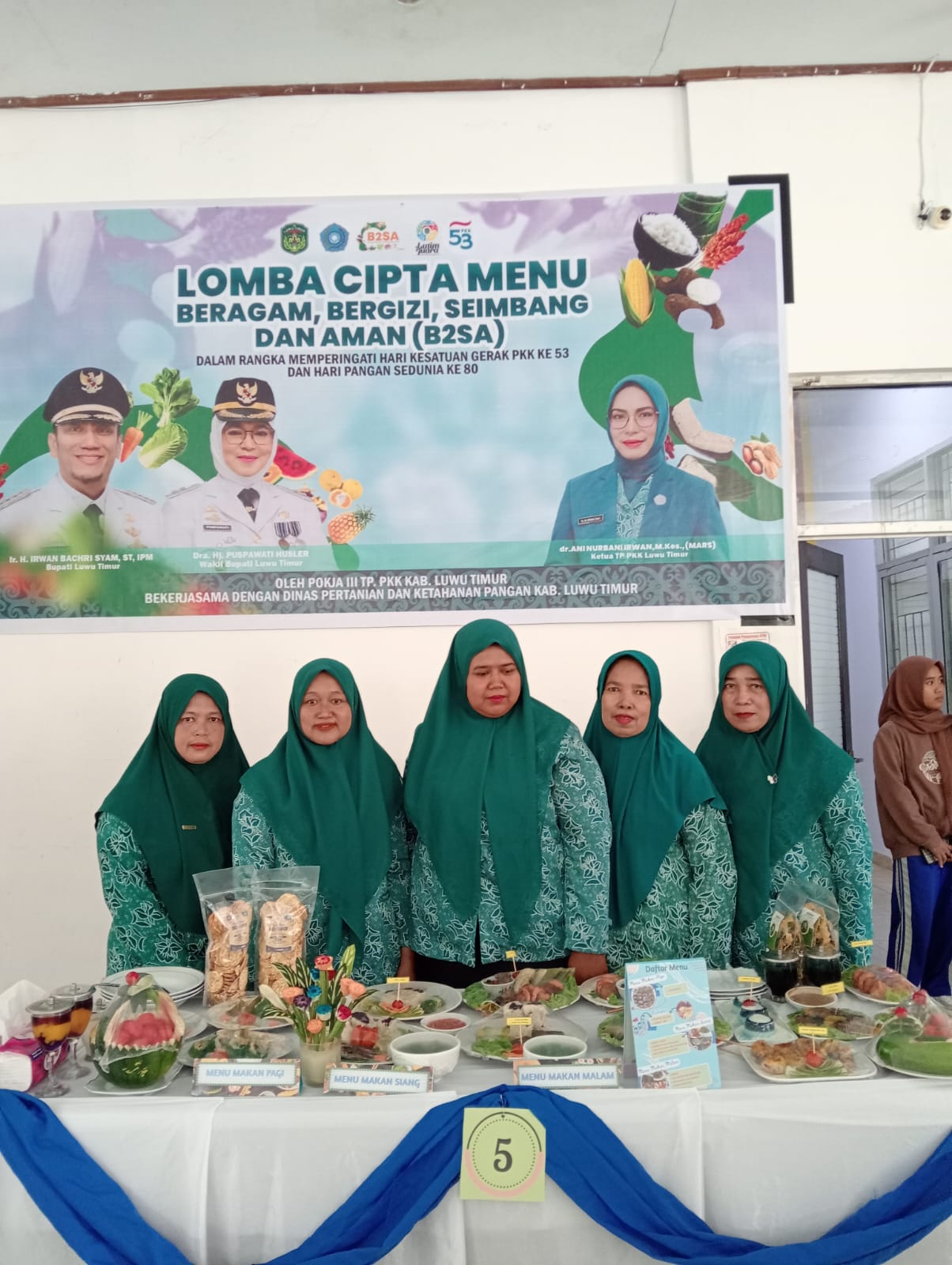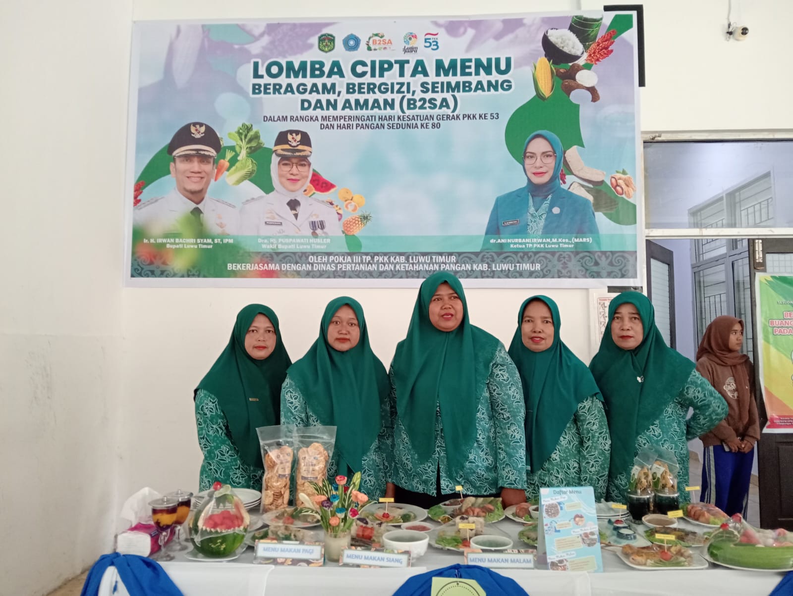 Luwu Timur, Chaneltimur.com – Tim Penggerak PKK Kecamatan Tomoni Timur kembali menorehkan prestasi gemilang. Untuk keempat kalinya secara berturut-turut, TP PKK Tomoni Timur berhasil meraih Juara 1 Lomba Cipta Menu Beragam, Bergizi, Seimbang, dan Aman (B2SA) tingkat Kabupaten Luwu Timur.