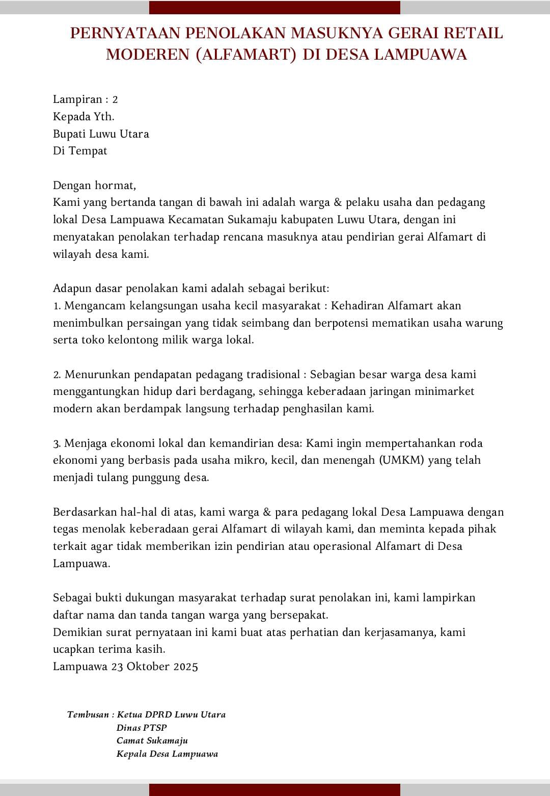 Penolakan itu disampaikan oleh masyarakat Lampuawa lewat surat pernyataan yang ditandatangani oleh seluruh tokoh masyarakat dan pelaku usaha UMKM didesa tersebut.