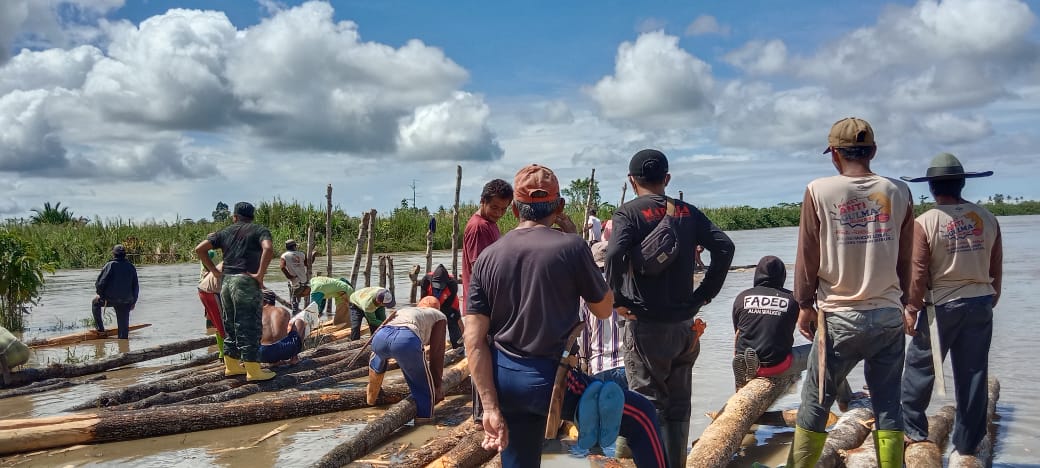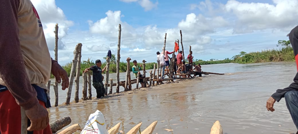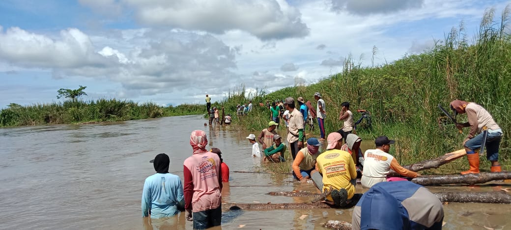 Miris, warga 4 desa terpaksa bergotong royong melakukan pemasangan tanggul sementara berupa patok kayu sebagai penahan banjir di desa Lembang-Lembang, kecamatan Baebunta Selatan, Luwu Utara.
