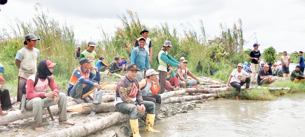 Dari pantauan awak media dilapangan, tampak warga dari 4 desa bahu membahu memasang Patok batang kayu berukuran besar layaknya tiang beton.